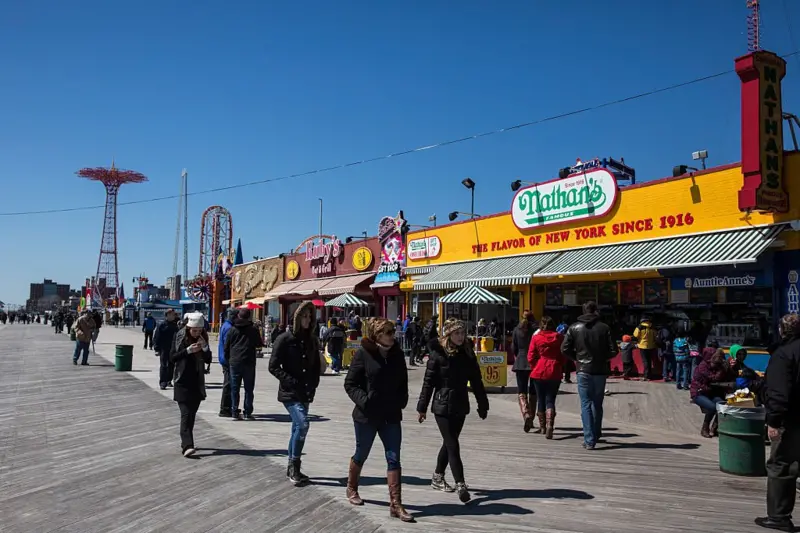 En una esquina se pueden ver bañistas bajo letreros altos y blancos con el nombre "Nathan's Famous" que se enorgullecen en anunciar las salchichas estilo Frankfurt conocidas desde 1916.